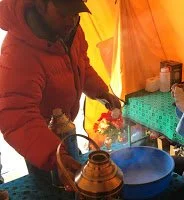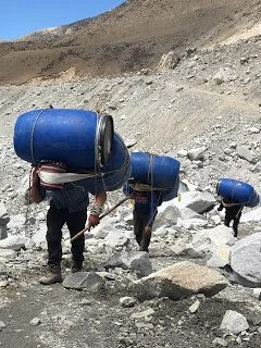 Everyday, the kitchen team works tirelessly to provide the climbers & Sherpa with not only surprisingly delicious food, but also clean water. At least a dozen times per day very strong Sherpa hike 10 minutes to a clean water supply, fill a 5-gallon jug, and carry it back to camp. I can hardly walk up the stairs to the dining tent without being out of breath!