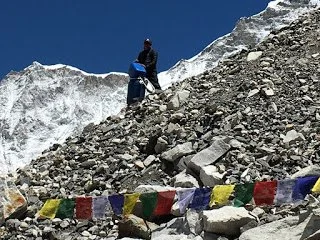 Finally, since all of base camp is built on rock and ice, regular maintenance is required as the ice melts. This afternoon, my tent was on the verge of sliding down a rocky precipice, so the team re-built its foundation. Think about shoveling rock at 17,500 feet when you’re having a hard day at work!