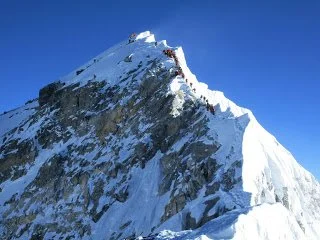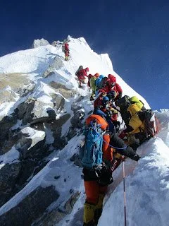 The long line of climbers that I was in moved slowly, so I took the opportunity to focus on taking care of myself by eating chocolate covered coffee beans and honey from the pocket of my down suit. This was a monumental task given the thick gloves and oxygen mask that I was wearing, but I was determined not to run out of fuel on this day. The toes of my right foot were starting to feel the effects of the cold night and I made frequent efforts to wiggle each toe to be certain that I could still feel it. I told myself that if I could no longer feel them, I would turn around.