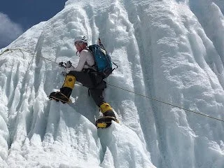 Climbing from base camp to camp 1. Two-thirty came early, but I was still excited to begin climbing. Base camp is comfortable, but it's a long way from the summit. I've always liked climbing in the dark because it's easy for me to focus on the circle of light coming from my headlamp and block every thing else out of my mind. It was hard to ignore; though, the seriousness of climbing through the Khumbu icefall. Occasionally I would hear a loud pop! as the ice continued to harden and crack in the cold night. There were several climbers and Sherpa starting out at the same time and for a while it felt like rush hour traffic as everyone vied for their place, based on their pace. A nearly full moon shone over me as I climbed up, over, and around towering blocks of ice. Just as the sun was rising, I heard a collapse of ice, but couldn't identify its location. My rule of thumb is that if I can feel the ice moving, I'm in trouble, but f I can only hear it I'm ok. I don't know if this is logical or not, but so far it has worked for me. When I heard the collapse I grabbed my Sherpa partner, Purba Rita and I think that I screamed right in his ear. We weren't in any danger, but it was still terrifying.