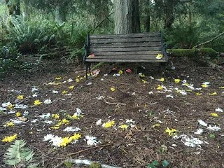 This evening I enjoyed my last trail run, just a short one to stretch my legs. My favorite trail is just a quick walk from my house. It is wooded, hilly, and secluded. In fact, in the hundreds of times that I have run on it, I have only seen one other person. Yet, my private trail is maintained, even decorated. All along it are odd shaped sticks, cairns, trinkets, memorials to pets, even tiny wind chimes. And tonight I was treated to this lovely bench.